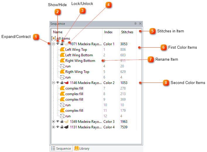 The Sequence view displays a running sequence of every item in your design, You can easily and quickly change sequence, show, hide elements, Lock elements, or insert a path in between elements