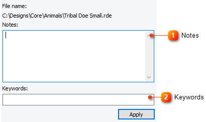 The properties contains quick access to settings in your design. Add notes to your design for instructions, Add keywords to make finding your design a snap!
