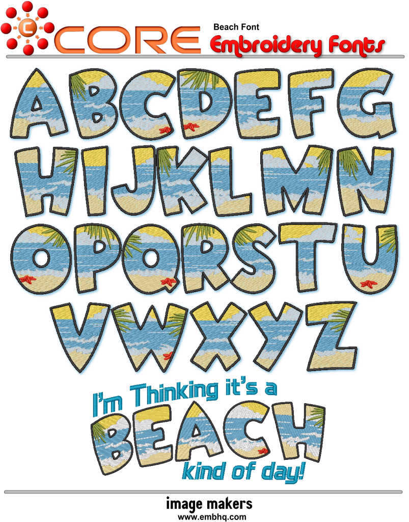 The Beach font is an all-caps font with a fun beach theme. 4 colors, intended for larger sizes. Think how cool it would look on towels, resort wear etc....