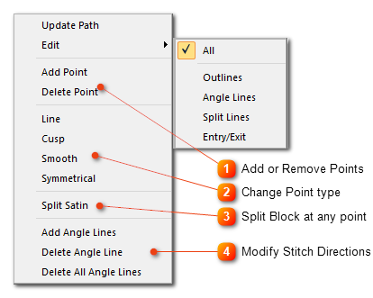 Change outline points, Change stitch direction, Entry and Exit points of your blocks.