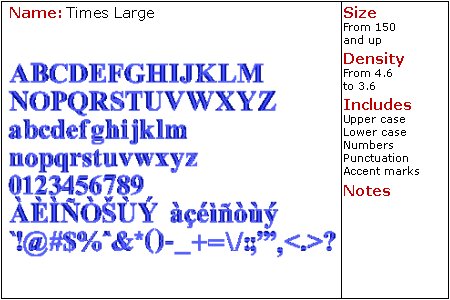 Times Large is a versatile font for large lettering such as collegiate wear, jacket backs etc.. Combined with Auto Outline on levels that support this feature and really make your embroidery stand out.